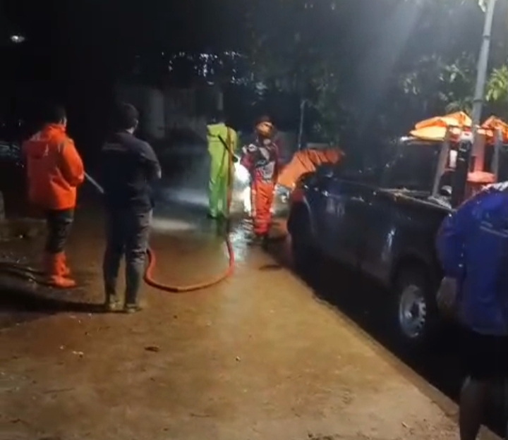 Terlihat dilokasi kegiatan BPBD Kabupaten Sukabumi sedang melakukan penyemprotan sisa lumpur yang menempel dijalan desa Cikidang antisipasi terjadinya laka lantas diwilayah lokasi bencana tersebut.