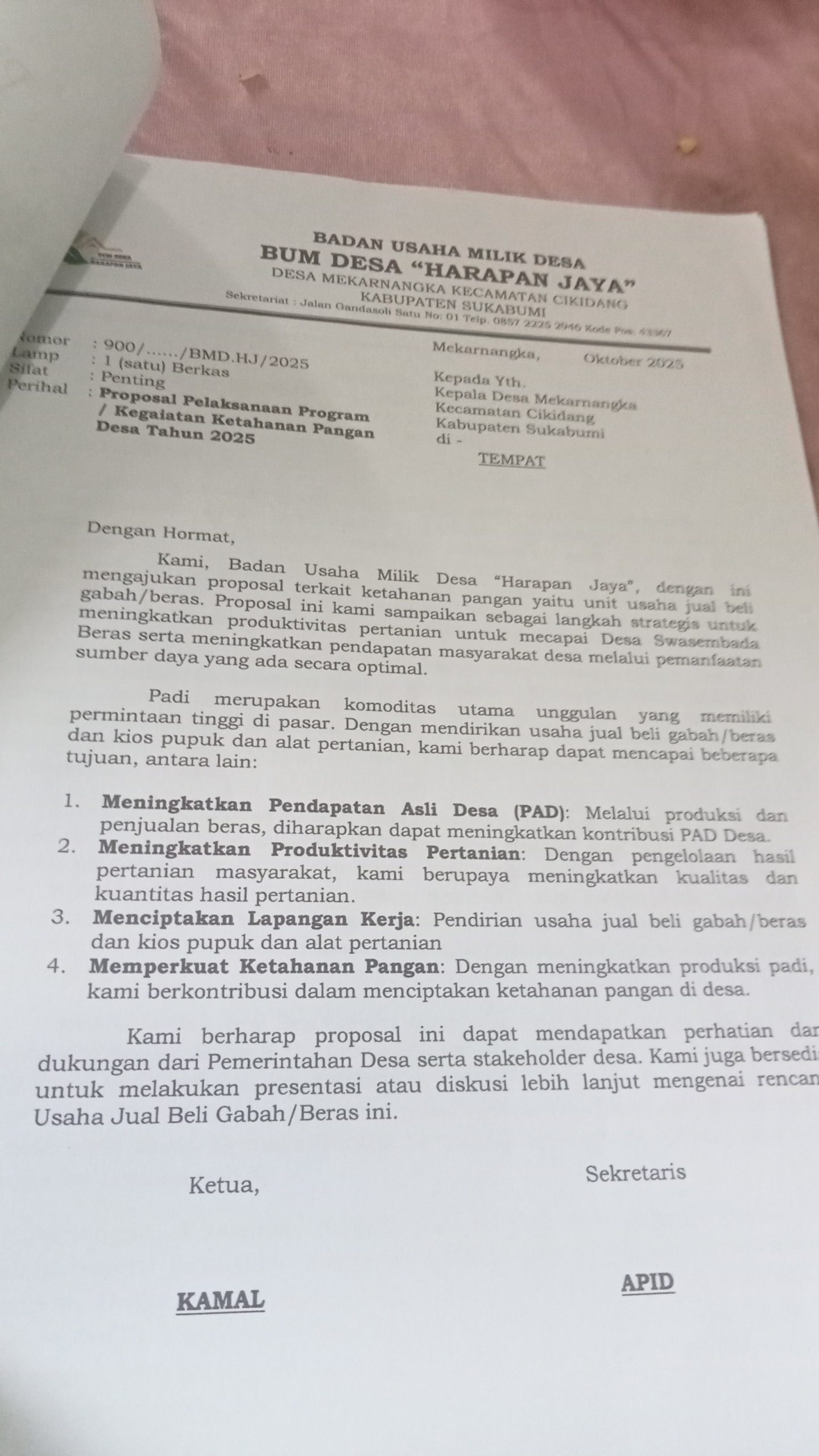 Sekretaris desa Mekarnangka Cepi juga menambahkan bahwa ” kita menunggu verifikasi kelayakan usaha BUMDES dan proposal dari BUMDES kedesa ” ungkapnya.