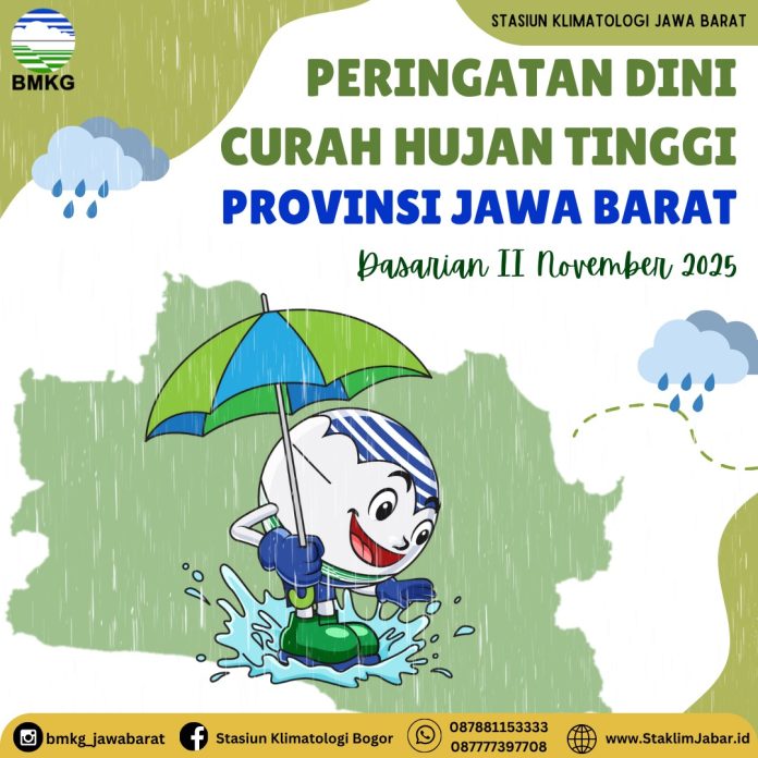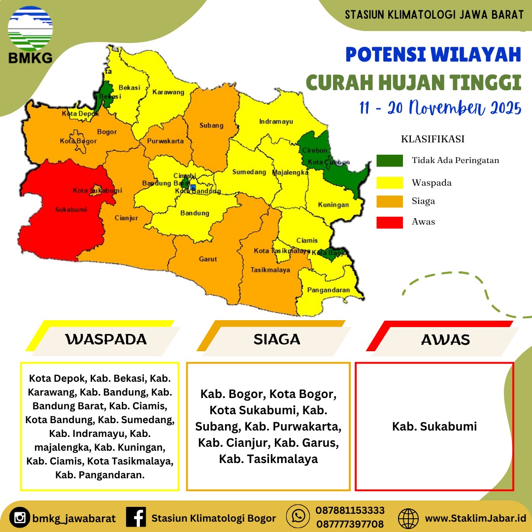 Sukabumi Kabupaten,Bossnewsmedia.com – Badan Meteorologi, Klimatologi, dan Geofisika (BMKG) Stasiun Klimatologi Jawa Barat memperingatkan potensi curah hujan tinggi di sejumlah wilayah Jawa Barat pada 11–20 November 2025. Potensi Wilayah Curah Hujan Tinggi Kabupaten Sukabumi masuk kategori awas.