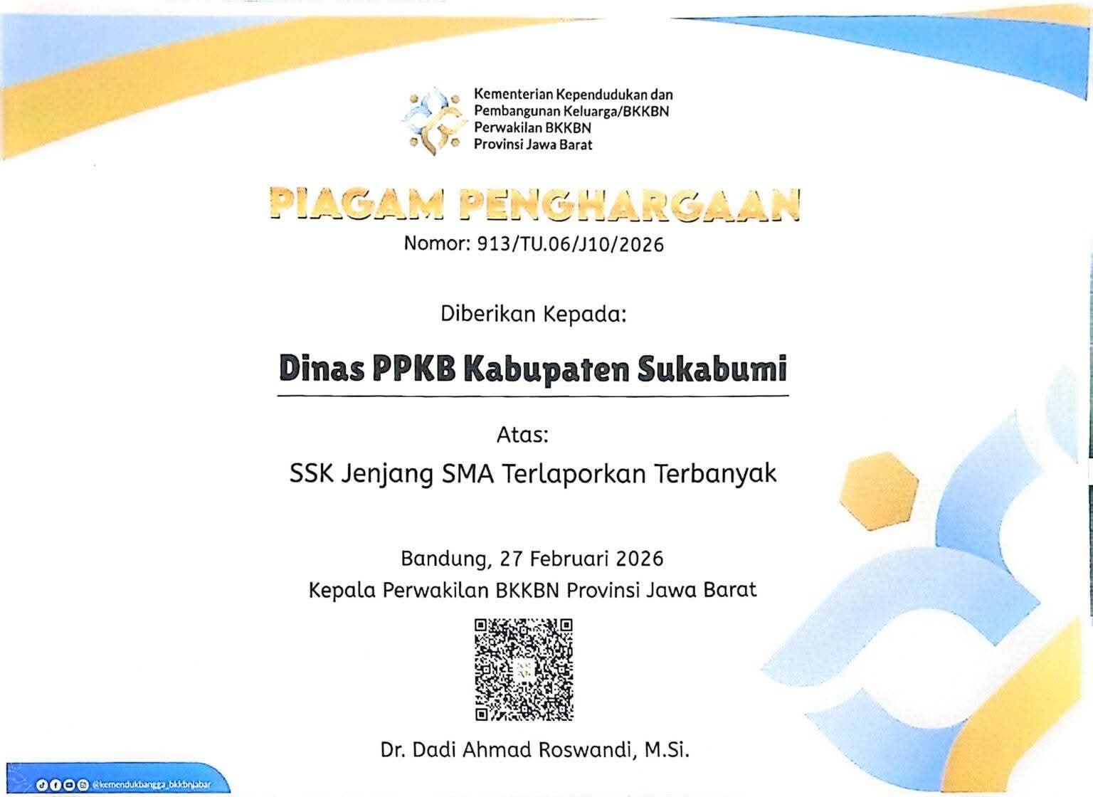 Prestasi membanggakan ini diterima DPPKB Kab Sukabumi dalam Rapat Koordinasi Daerah (Rakorda) Program Pembangunan Keluarga, Kependudukan, dan Keluarga Berencana (Bangga Kencana) Tingkat Provinsi Jawa Barat Tahun 2026 yang diselenggarakan di Bandung