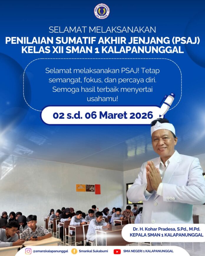 Sukabumi Kabupaten,Bossnewsmedia.com – Selamat dan semangat melaksanakan PSAJ (Penilaian Semester Akhir Jenjang) bagi seluruh siswa kelas XII SMAN 1 Kalapanunggal, 02-06 Maret 2026.