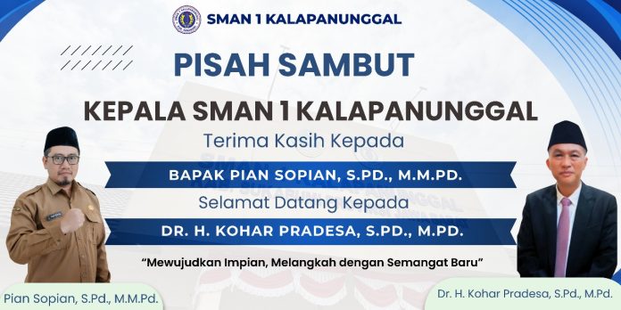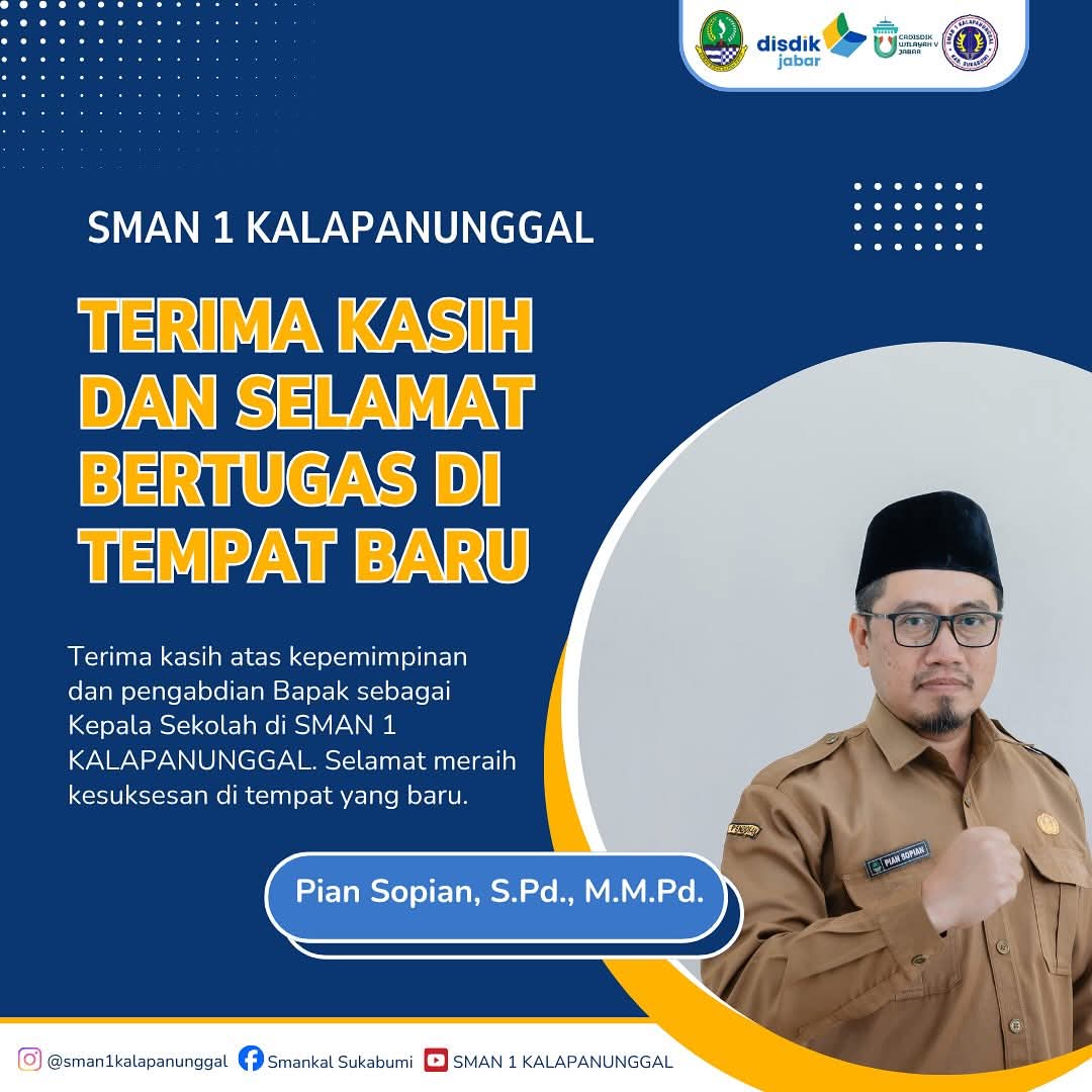 Terima kasih atas kebersamaan, keteladanan, dan kasih sayang selama ini, Keluarga Besar SMA Negeri 1 Kalapanunggal Mengucapkan terimakasih dan selamat atas kepemimpinan Bapak Pian Sopian Meski kini langkah kita berbeda arah, kenangan indah akan selalu terukir di hati kami.