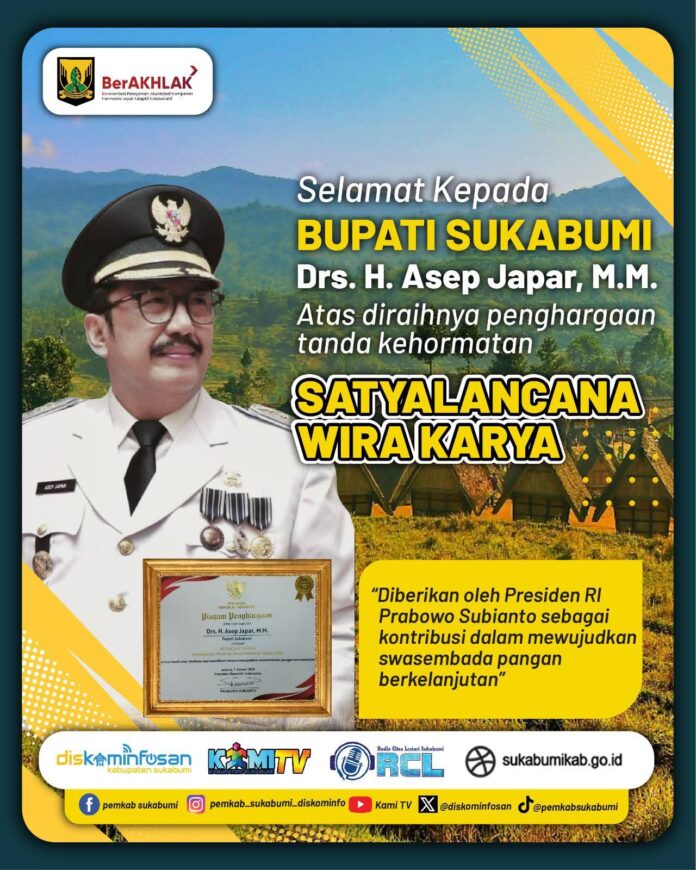 HomeSukabumiSelamat Kepada Bupati Sukabumi Atas Prestasi, Penghargaan Lencana SATYALANCANA WARA KARYA, Dari... Sukabumi Selamat Kepada Bupati Sukabumi Atas Prestasi, Penghargaan Lencana SATYALANCANA WARA KARYA, Dari Presiden Republik Indonesia By Irsan Riswandi - February 8, 2026 0 12 FacebookTwitterPinterestWhatsApp Sukabumi Kabupaten,Bossnewsmedia.com – Selamat Kepada Bupati Sukabumi Atas Prestasi, Penghargaan Lencana SATYALANCANA WARA KARYA, Dari Presiden Republik Indonesia. ” Bersama Kita Ciptakan Sukabumi Mubarakah “. Red FacebookTwitterPinterestWhatsApp Previous articleKetua DPRD Kabupaten Sukabumi Budi Azhar Mutawali,S.Ip,M.Si Mengucapkan Selamat Harlah NU ke 100 Tahun 2026 Irsan Riswandi Related Sukabumi Tugu Ikan Layur Jadi Ikonik Kelurahan Palabuhanratu Sukabumi Desa Perbawati Kembangkan Komoditas Pertanian Unggulan, Dorong Perekonomian Masyarakat Sukabumi Bupati Sukabumi H. Asep Japar Menerima Silaturahmi Kaukus Perempuan Politik Indonesia (KPPI) LEAVE A REPLY Cancel reply Comment: Please enter your comment! Name:* Please enter your name here Email:* You have entered an incorrect email address! Please enter your email address here Website: Save my name, email, and website in this browser for the next time I comment. Trending Pembentukan Forum Silaturohmi ORMAS, OKP DAN LSM kecamatan Bojonggenteng Berjalan lancar dan Sukses March 16, 2023 Diduga Demi Untung semata Oknum Manajer PLN UPJ Palabuhanratu Sengaja Pasang Kabel Salah Spek Tech Bentangan Kabel SRT Ukuran 2 Kali 10 Sepanjang 400... March 25, 2025 Pepen Supendi Menjadi Calon Kuat Ketua DPC PAMDI Kabupaten Sukabumi January 15, 2025 Gerak Cepat Iman Adinugraha, SE.,,Akt Anggota DPR-RI Fraksi Demokrat Bantu Bangun Infrastruktur Kecil Di Gobang Desa Pasirsuren kecamatan Palabuhanratu February 15, 2025 Masyarakat Komunitas Peduli Atas Fasilitas Pemerintah Perbaiki Jalan di Pasir Reungit Cidahu May 14, 2024 Kades Parungkuda Kedatangan Kuasa Hukum Masyarakat Minta Pasilitasi Audensi Dengan PerusahaanTerkait CSR PT.Nina 2 May 10, 2023