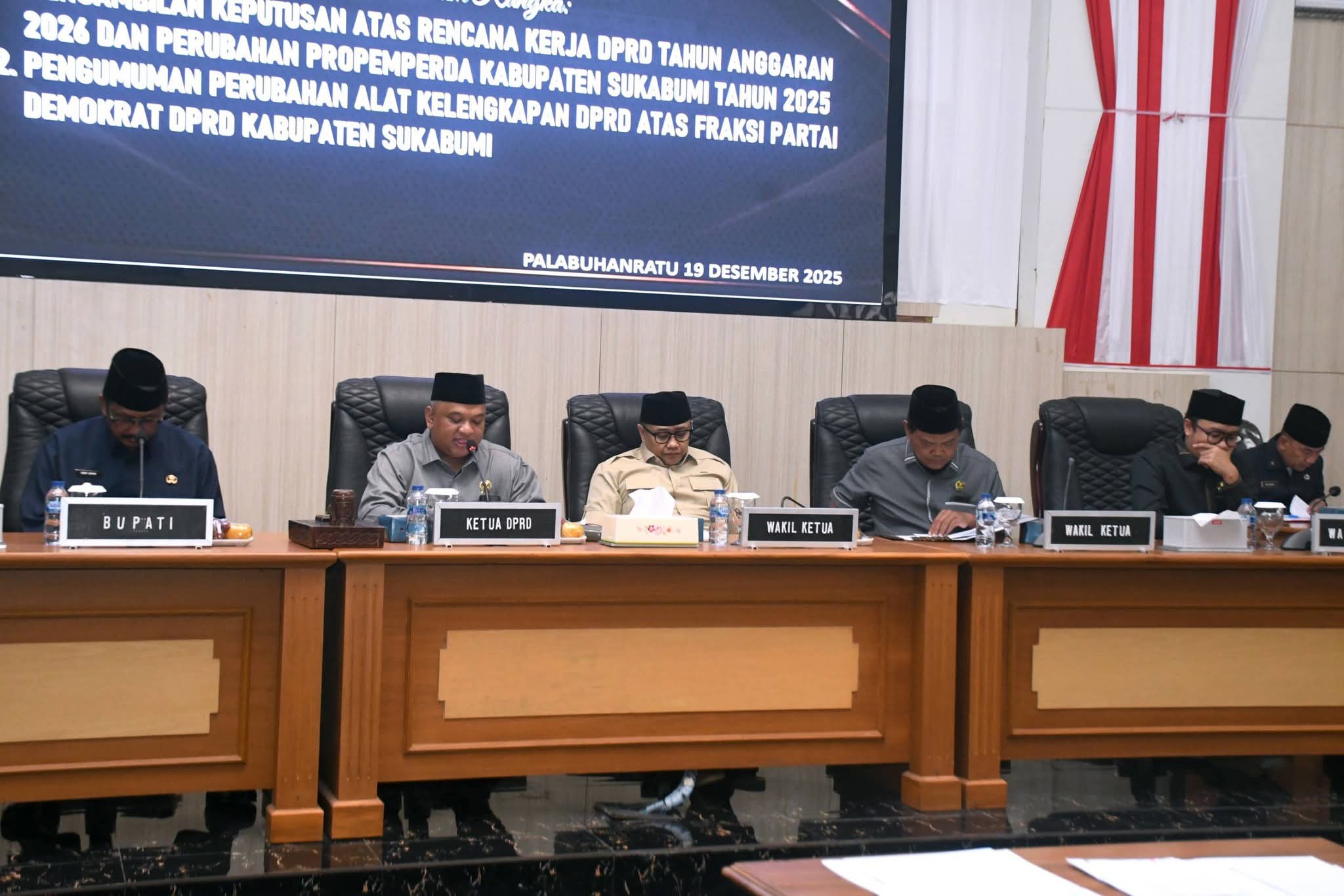 Sukabumi Kabupaten,Bossnewsmedia.com – DPRD Kabupaten Sukabumi menggelar Rapat Paripurna dengan agenda pengambilan keputusan atas rencana kerja DPRD tahun anggaran 2026 dan perubahan propemperda Kabupaten Sukabumi tahun 2025 serta pengumuman perubahan alat kelengkapan DPRD atas fraksi partai demokrat DPRD Kabupaten Sukabumi.
