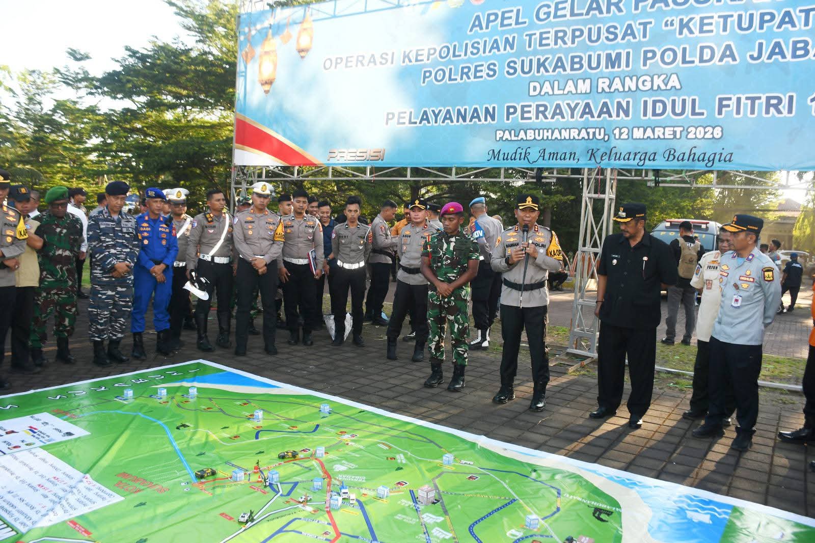 Dalam kesempatan itu, Kapolres didampingi langsung oleh Bupati Sukabumi H Asep Japar sebagai bentuk dukungan Pemkab. Sukabumi terhadap kesiapan pengamanan arus mudik dan balik Lebaran.